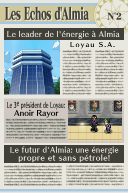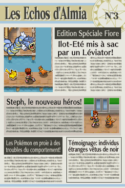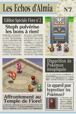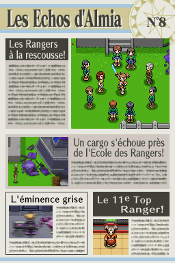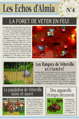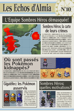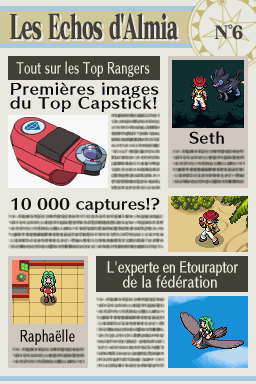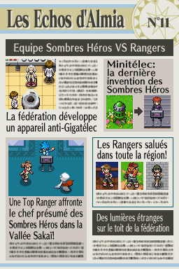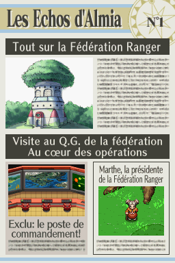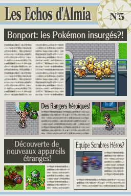Dans "Nuit sur Almia", un journal nommé "Les Échos d'Almia" permet de raconter les faits se déroulant dans la région, surtout concernant les Pokémon Rangers et les méfaits des Sombres Héros. Retrouvez ici les 13 éditions du journal ! Vous pouvez également les consulter dans la maison le plus à l'ouest de Bonport, au premier étage.Recherche