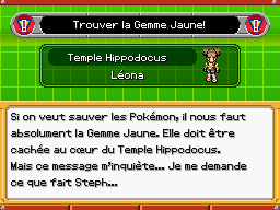 Une fois vaincu, il vous donnera la Gemme Jaune ! Mission accomplie... Mais où est Steph ? Vous le saurez rapidement car à peine sorti du sanctuaire de Cresselia, un hélicoptère des Sombres Héros avec à l'intérieur Steip, l'un du Sinis-Trio descend à votre rencontre ! C'était Steip qui vous envoyait les "gogogrammes", Steph avait été capturé ! Vous serez obligés de céder la Gemme Jaune contre votre ami, avec un cadeau en prime :