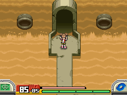 Entrez dans le temple ! Capturez les Grolem disponibles dès le début, ils peuvent rapporter pas mal d'expérience si bien capturés ! Vous arriverez après peu de temps nez-à-nez avec un labyrinthe de sable ! Faites attention aux boules de sable qui peuvent vous faire tout recommencer ! Allez-y patiemment et attendez que les tubes jettent une boule pour avancer.