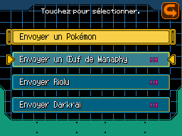 Comme l'indique l'image ci-dessus, les Pokémon transférables seront donc un Oeuf de Manaphy, un Riolu et un Darkrai. Pour pouvoir les transférer, vous devrez donc d'abord terminer leur mission spéciale respective, téléchargeable en Wi-Fi seulement. Attention, vous ne pouvez les transférer qu'une seule fois de votre cartouche, peu importe si vous recommencez le jeu après ou non !Transférer ces Pokémon n'est pas compliqué : il vous faut tout d'abord deux consoles compatibles avec les jeux Nintendo DS. Allez dans le menu principal de Nuit sur Almia et sélectionnez "Réseau Ranger" puis "Envoyer un Pokémon" et choisissez le Pokémon à transférer. Sur l'autre console, insérez votre jeu Diamant, Perle, Platine, HeartGold ou SoulSilver et allez dans Cadeau Mystère, puis choisissez "Recevoir le cadeau" et enfin "d'un ami". Suivez les instructions indiquées par la suite.
