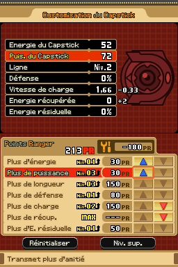 Option nouvellement accessible via le menu du Capstick, cette fonction vous permettra d'améliorer les capacités de votre Capstick, moyennant quelques Points Ranger.Les différentes améliorations disponibles seront débloquées en deux temps : les trois premières, basiques, lorsque Panéma aura réparé votre Capstick avant de vous rendre à la tour Radio. Les quatre autres, plus complexes, seront utilisables dès que vous serez revenu des Ruines de l'Aube, toujours grâce aux bons soins de Panéma.