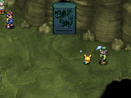Capturez le Pachirisu si vous n'avez plus de Pokémon avec Recharge, puis continuez aussi à droite. Vous retrouverez deux sbires qui, non contents d'avoir volé un glyphe étrange sur la stèle, s'en prennent à Pichu Kulélé. L'un des deux lui casse son ukulélé...