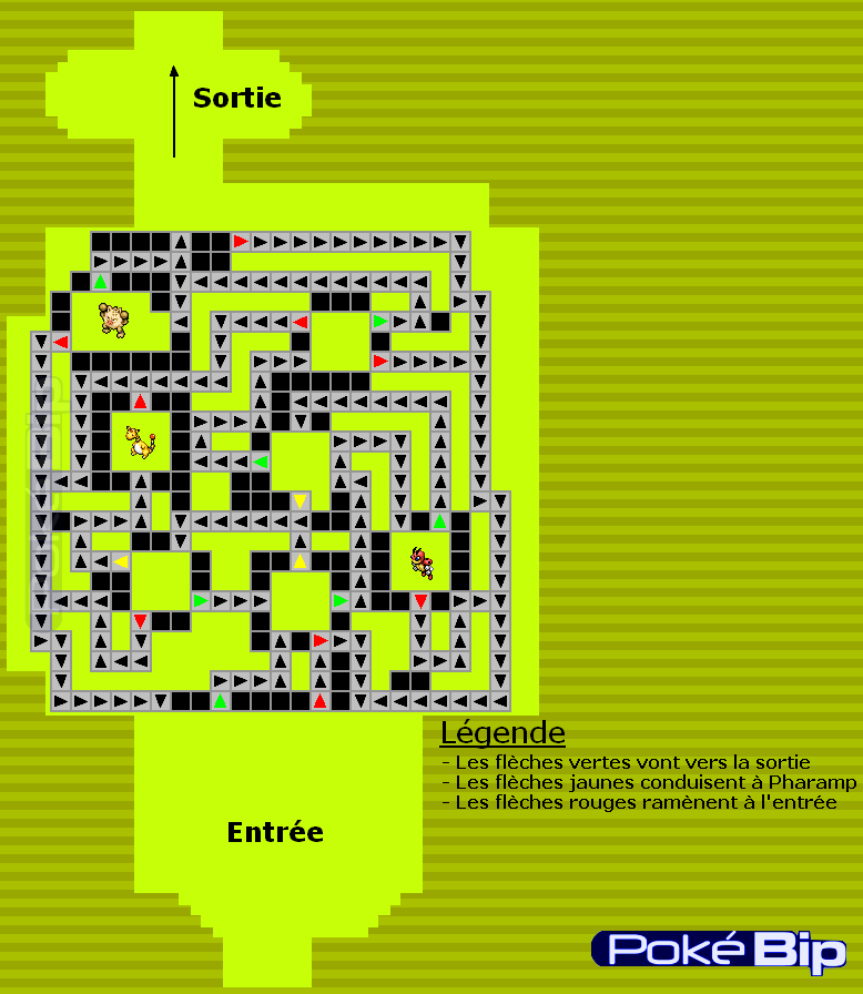 Dans cette première pièce, toutes les flèches de droite ramènent à Coxyclaque. Celle du bas vous emmène vers Pharamp si vous avez eu des problèmes pour capturer Coxyclaque. Si vous désirez continuer, prenez celui de gauche. Une fois arrivé, prenez la flèche en haut à droite pour arriver devant Colossinge. Capturez-le, puis empruntez la dalle du haut pour atteindre la sortie.