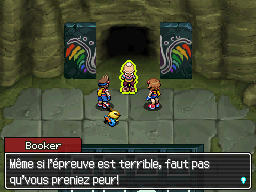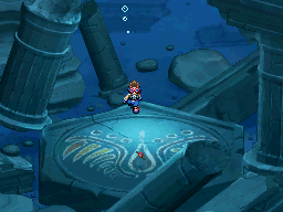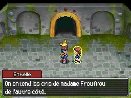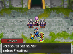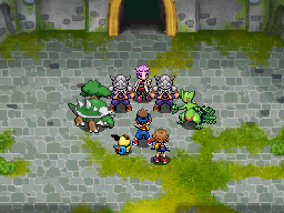 Vous êtes à l'entrée des vestiges. Rappelez vous, vous avez vu Froufrou se faire emmener par des Armurois. Entrez donc pour la délivrer ! Pour vous en empêcher, les Armurois envoient sur vous un Jungko et un Torterra.