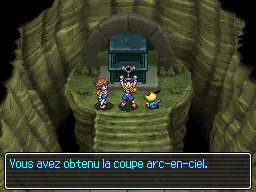 Une fois en bas, vous déposez la coupe sur l'autel. Celle-ci s'illumine, puis jaillira un arc-en-ciel, qui appellera le Pokémon légendaire Ho-oh.