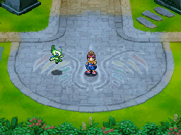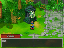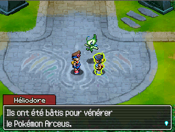 Une fois apprivoisé, le petit voyageur vous emporte avec lui à travers les âges. Vous rencontrez alors Héliodore, gardien du temple qui siégeait à l'époque à côté de la Stèle Temporelle. Il vous explique que de nombreux temples comme celui-ci ont été bâtis pour vénérer Arceus. Il gronde sévèrement Célébi, son compagnon, qui vous ramène alors dans le présent, puis disparait. Les villageois reviennent peu à peu, inconscients de votre aventure.