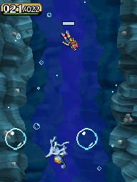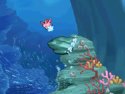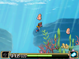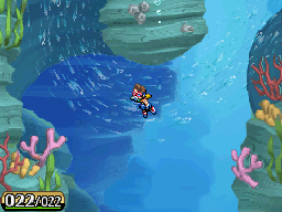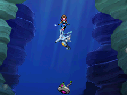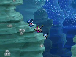 Vous voilà projeté au fond des mers. La première zone n'est pas très complexe, il vous suffira de descendre, tout en capturant les Pokémon présents pour vous constituer une équipe en cas de besoin.