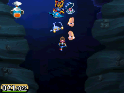 Vous vous rendrez compte à votre arrivée que la lumière n'atteint pas ces profondeurs, ce qui vous oblige à progresser sans carte. Vous pourrez apercevoir des lumières jaunes, correspondant au Pokémon Loupio, qui augmentera la visibilité, et des lumières rouges, pouvant correspondre à votre objectif, ou à des Sharpedo, des pokémon agressifs qui peuvent vous charger, et infliger deux dommages à votre Capstick. Il suffira de pointer les lumières avec votre stylet pour en connaitre la nature.| Pokémon Sauvages dans la zone | |||||
