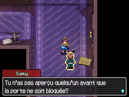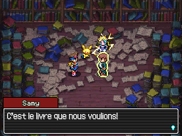 En arrivant dans cette salle, vous entendrez des voix provenant de l'autre côté de la bibliothèque. Approchez vous de la bibliothèque centrale, et sélectionnez la. Vous verrez un livre dépasser. Poussez le et vous libèrerez un passage secret, derrière lequel se trouve... Samy ! Après ces retrouvailles, rentrez dans le passage.