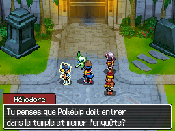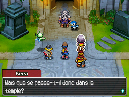 Après ce combat, l'Armuroi rentre dans le temple, puis Keea commence à mettre la situation au clair. Le desservant semblait possédé. Héliodore s'inquiète pour les Pokémon du temple, et Keea vous propose d'aller les sauver.