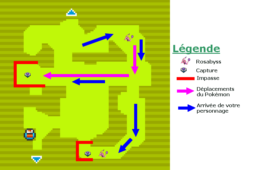 Ensuite, vous pourrez remonter par la gauche pour poursuivre le premier Rosabyss, et le capturer une fois bloqué dans la niche de gauche. Ensuite, entrez dans le tunnel à droite. Vous y trouverez le second poisson rose, que vous devrez aussi capturer, une fois coincé contre le pilier fraîchement écroulé. La carte ci-dessous résume les mouvements nécessaires à la capture de ces deux Pokémon.