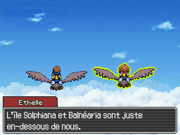 Vous retournez chez Targos, et Éthelle annonce que son Étouraptor a aussi récupéré. Vous allez donc pouvoir aller à Balnéaria, sur l'ile Solphiana. Sortez et capturez l'Étouraptor. Utilisez ensuite sa Poké-Aide pour vous envoler.