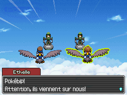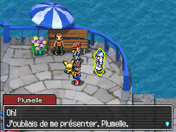 Une fois les Pokémon calmés, vous pourrez redescendre sur la terre ferme. En arrivant, vous faites la connaissance de Plumelle, grande amatrice de Pokémon Oiseaux. Si vous capturez des Pokémon dans le ciel, vous pourrez demander à Plumelle de les appeller.