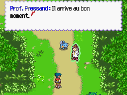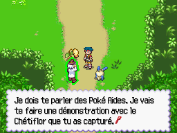 Alors que vous entrez dans la forêt, un Chétiflor bondit devant vous. C'est l'occasion pour le Prof. Pressand de vous apprendre à utiliser la Poké Aide Plante. Plus loin sur le chemin, un Gobou lui donne l'occasion de vous faire la démonstration de la Poké Aide Eau.