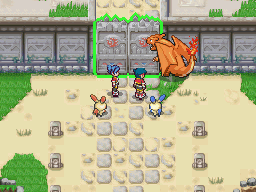 En arrivant, les portes d'entrée du Temple de Fiore sont ouvertes, mais un Sbire Go-Rock les refermera après vous avoir nargué. Elles demandent Brûlure de niveau 3 pour s'ouvrir, sauf qu'il n'y a aucun Pokémon sauvage dans cette zone. Heureusement, le Dracaufeu des Ruines Olive les ouvrira pour vous en remerciement.