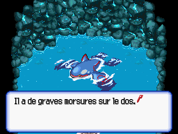 Vous découvrez au fond du vortex que les évènements de ces derniers jours sont causés par la présence de Kyogre dans la Mer Safran, qui tente tant bien que mal de se remettre d'un récent combat contre Groudon. Il attaque avec des vagues, attention à ne pas les toucher ! Paralysez-le avec votre partenaire (chargez-le tour après tour, patiemment, entre les vagues, au besoin), puis capturez-le le plus vite possible. Si vous n'arrivez pas à faire tous les tours d'un seul coup, recommencez depuis le début, vous n'aurez pas le temps de faire deux tentatives entre deux vagues. Une fois capturé, il s'en ira.