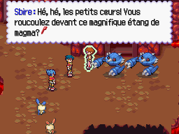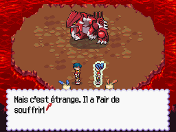 Engagez-vous dans le passage derrière le Sbire. Si vous continuez jusqu'à la grotte d'Entei, vous pouvez capturer un Volcaropod et un Arcanin. Si vous allez jusqu'à la grotte des Salamèche, vous trouverez des Reptincel. Il y a aussi un trou à côté du Rhinoféros : ne sautez pas dedans si vous n'avez pas les deux Tartard avec vous, et votre Capstick entièrement rechargé, car au fond vous attend Groudon.