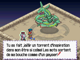 Vous vous rendez compte que face à Rayquaza, Chris n'est plus si silencieux que ça. Il est même impossible à arrêter dans ses élans lyriques. Utilisez Oniglali ou Ectoplasma pour immobiliser Rayquaza ! De retour à la Base, Chris, que plus personne ne peut arrêter sur sa lancée, vous appelle « Ranger légendaire ».