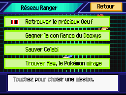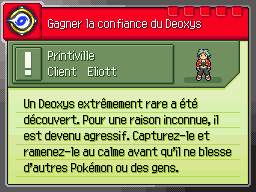 Cette mission, déblocable uniquement via un mot de passe, vous permet de chercher un Œuf de Manaphy. Contrairement aux autres, celui-ci est transférable ! Toutes les informations nécessaires sur cette mission sont disponibles sur la page la concernant.Gagner la confiance de Deoxys