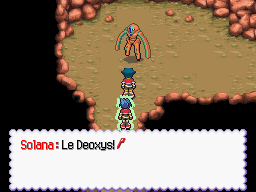 Finalement, Deoxys vous attendra devant l'antre à Hariyama. Il changera de forme durant la capture, mais seule la forme de base la terminera.