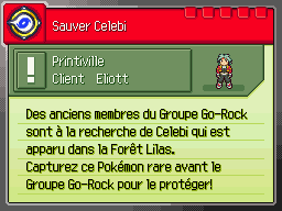 Samy, le Ranger au Ramoloss, est frustré de n'avoir que des missions du genre "changer les ampoules" ; aussi est-il plus que ravi lorsqu'Eliott l'envoie vous accompagner pour sauver Celebi du Groupe Go-Rock qui le poursuit dans la Forêt Lilas.