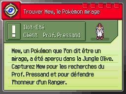 Une fois les Pokémon capturés, retournez dans la zone où se trouve Mew et faites en sorte d'engager le combat avec lui uniquement. Utilisez la Poké Aide Spectre de Munja pour assurer votre capture ! Le Prof. Pressand est ravi de posséder enfin les données de capture de Mew, et Tim de voir qu'il n'avait pas rêvé. Mew s'en retourne jouer ailleurs.
