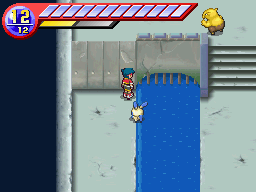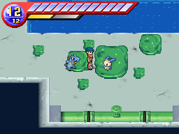 Après un petit moment de marche, vous croiserez Victoire, de l'autre côté d'un canal. Sans vous dire comment traverser, elle repart, à la recherche d'un membre du Groupe Go-Rock. Continuez un peu vers le nord et capturez Saquedeneu, pour utiliser sa Capacité Terrain Traverse grâce au Poteau de l'autre côté. Traversez le tuyau pour arriver dans une petite zone menant à un autre tuyau sur votre gauche.