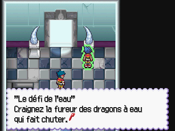 Le défi de l'eau se trouve derrière la première porte ornementée que vous trouverez dans les Ruines, près de l'entrée. Pour relever ce premier défi, il faut avancer avec prudence mais sans hésiter, sous peine de chuter et devoir tout recommencer depuis le début.Au bout du chemin, vous affronterez deux Hyporoi. Faites preuve de patience, une boucle à la fois, ne levez le stylet que lorsque tous les tours ont été décomptés et que le Pokémon cible est hors de l'eau.