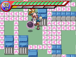 Vous arrivez à un couloir horizontal. La porte de gauche est verrouillée. À droite, faites attention aux tapis roulants. Commencez par prendre ceux qui vont vers la droite, puis contournez les autres et prenez ceux qui vous mènent vers Scarabrute. Pour aller au fond, c'est un peu plus compliqué, suivez ces images si vous n'y arrivez pas :