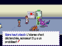 Prenez la porte à gauche du couloir horizontal et traversez le hangar, l'escalier est en bas à gauche. Le Prof. Pressand déclenche une alarme en voulant ouvrir une porte, ce qui fait venir un Sbire accompagné d'un Migalos et d'un Nostenfer. Si Posipi / Négapi est déchargé, une Poké Aide Spectre fera l'affaire. Derrière la porte où se trouvait le Sbire se trouve un Insécateur, qui permettra de couper la Grosse Cage au fond du couloir.