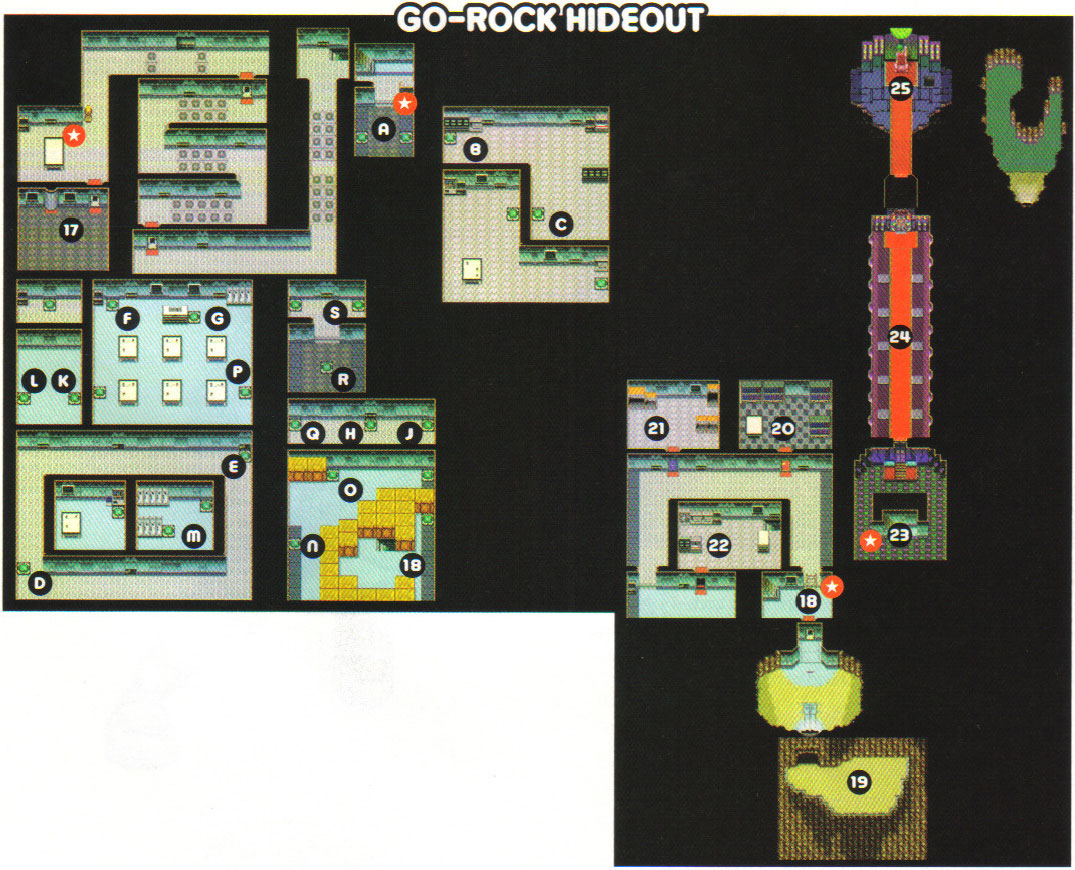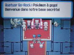 Prenez la porte du bas et continuez vers le bas pour sortir du repaire. Votre collègue ranger vous retrouve. Capturez le Farfuret à proximité et revenez en arrière détruire la barrière de métal. Assurez-vous d'avoir un Capstick en état et des pokémon pour vous aider. Sauvegardez fréquemment pour reprendre en cas de combat raté. Prenez la porte rouge en haut, vous y retrouvez Kaitlyn, une membre des Go-Rock, qui vous attaque avec deux Camerupt. Une fois battue, elle ira voir son frère dans la porte bleue. Allez ouvrir cette porte où Kénan vous attend avec Parecool, Vigoroth et Monaflemit. Les deux vilains battus, ils iront voir leur 3ème frère à la porte blanche. A l'intérieur, Kévin vous attaque avec deux Insécateur et un Cizayox. Les trois gaillards fuient par l'escalier, suivez-les. Avancez dans les couloirs jusqu'à la salle finale. Capturez quelques Mackogneur qui s'avèreront très utiles.