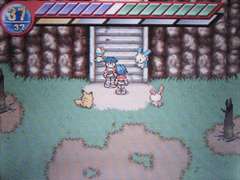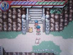 Un des chemins possibles est le suivant : gauche, haut, bas gauche, droite, droite, gauche, haut droite. D'autres chemins sont possibles, vous devez d'ailleurs tous les essayer si vous voulez rencontrer tous les pokémon. Au bout, descendez l'escalier.