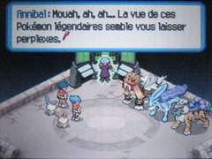 Annibal vous attaque avec Raikou pour commencer. Pour le capturer, attendez que les éclairs qu'il a créé disparaissent. Ensuite, il n'est plus très difficile à capturer, il faut 11 tours, Grolem vous aidera beaucoup dans cette tâche. Annibal vous attaque ensuite avec Suicune. Le pokémon glace lance immédiatement l'attaque Reflet ce qui fait apparaitre 3 Suicune sur le terrain dont 2 illusions. Si vous tournez autour des illusions, elles disparaissent et Suicune en recrée deux. Pour le capturer, détruisez une illusion et paralysez les deux pokémon restants avec Posipi/Négapi. Il ne reste alors que Suicune assez facile à capturer. Annibal s'apprête ensuite à vous attaquer avec Entei mais Posipi et Négapi détruiront le Méga-Capstick. Entei devient incontrôlable et attaque Annibal, vous devez calmer le pokémon volcan. Commencez par faire des cercles uniques autour du pokémon pour détruire les flammes qui le protègent. Une fois "nu", il sera plus facile à capturer. Paralysez-le et évitez les gerbes de flammes au sol.