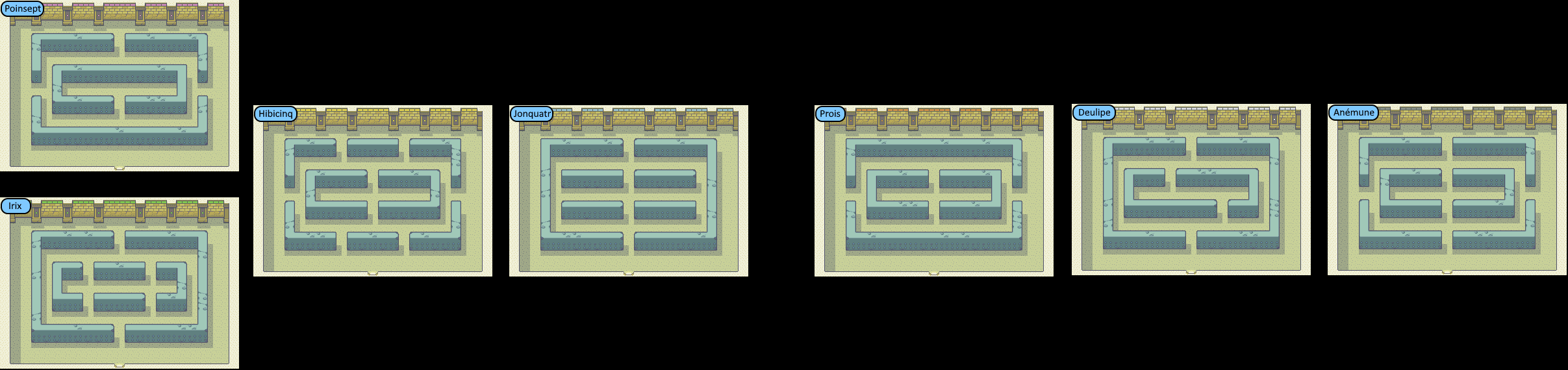 Ces salles sont nommées d'après leur numéro et une variété de fleur :