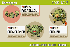 ![]() | Montagnes | Permet de voir les Pokémon que vous avez rencontré en montagne. |