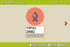 ![]() | Pokémon rares | Permet de voir les Pokémon non localisables, comme certains Pokémon Légendaires. |