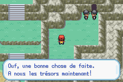 Vous aurez un mot de passe grâce à leur inattention : "ICI, GIRAFARIG, ICI". Ils remarqueront votre présence, allez vous battre contre les deux, ils sont faciles à battre. Entrez dans la grotte.