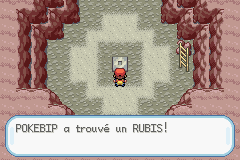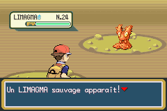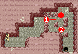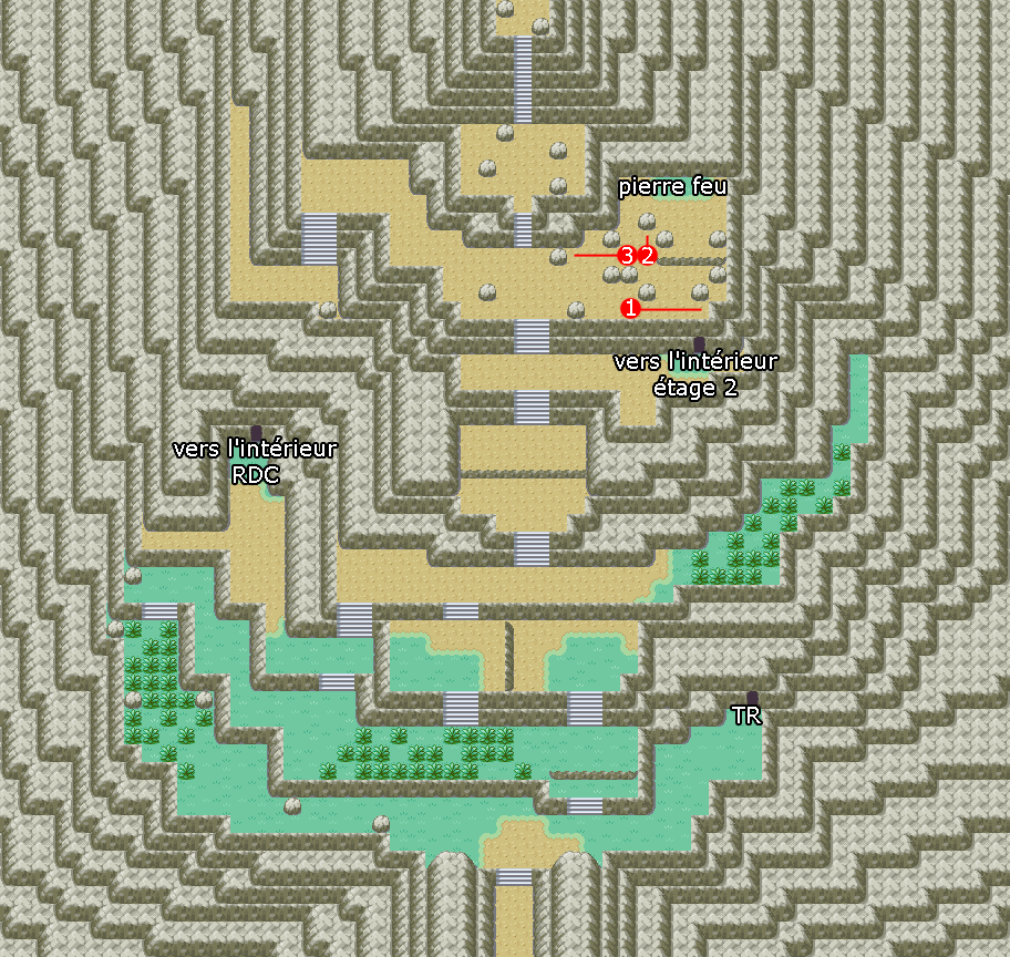 Dans la grotte, vous avancez, vous commencerez par le côté "gauche", consultez donc les cartes de "gauche" pour l'instant. La grotte est assez courte, vous rencontrerez pour la première fois Limagma, un des Pokémon de seconde génération, c'est-à-dire ceux dont le numéro va de 152 à 251, issus à l'origine de Pokémon Or, Argent et Cristal. Au SS2, poussez les rochers dans l'ordre pour ouvrir le chemin.