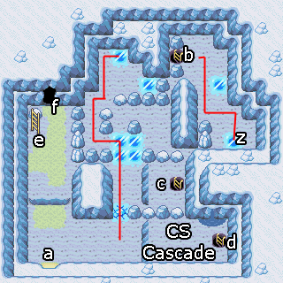 Dans la salle 2, suivez la ligne rouge puis cassez la glace en marchant là où la ligne s'arrête. Une fois en bas, prenez l'échelle B puis cassez la glace au point Z. Suivez la ligne rouge des cartes puis prenez l'échelle D. Vous trouverez face à vous la CS Cascade qui permet de monter les cascades à contre-courant. Retournez à la salle 1, le première que vous avez vu. Montez en haut de la cascade grâce à la CS puis prenez l'échelle E.