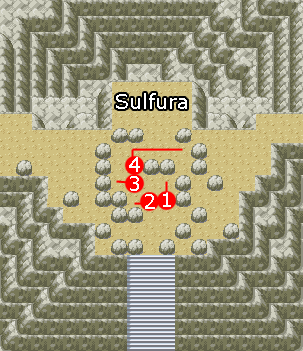 Au sommet, déplacez les rochers comme indiqué sur la carte . Vous trouverez Sulfura, le Pokémon légendaire de feu ! Si vous voulez l'attraper, il faut l'affaiblir au maximum puis l'endormir et de lancer des Hyperballs jusqu'à ce qu'il se laisse capturer.