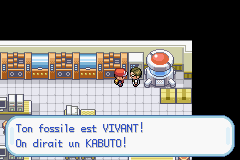 Allez au laboratoire prendre le fossile, il sera transformé en Kabuto ou Amonita, deux Pokémon de type eau/roche.