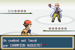 Auguste a un Caninos de niveau 42, un Ponyta de niveau 40, un Galopa de niveau 42 et un Arcanin de niveau 47. Avec un Pokémon eau de bon niveau, vous n'aurez aucun mal. Seul l'Arcanin, puissant, peut poser problème s'il n'est pas battu rapidement. Vous remporterez le 7ème badge de la Ligue et la CT38 Déflagration. Bien que très puissante, cette attaque est peu précise (85%), préférez une attaque plus précise.