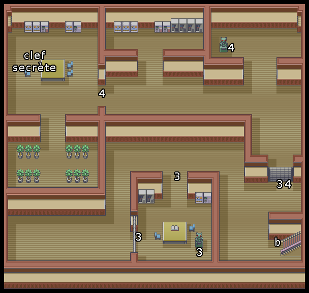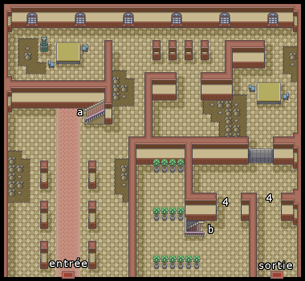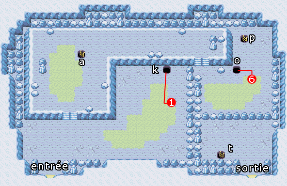Continuez en prenant les échelles H puis I puis A. Vous serez au Rez-de-chaussée . Allez au rocher 6 et poussez-le dans le trou O, suivez-le, poussez-le dans le trou Q (j'entends déjà les rires de certains), suivez-le et dans le trou F, suivez-le. Vous serez au Sous-sol 3 . Allez à l'échelle R puis S puis T. Sortez de la grotte, vous serez de l'autre côté de la route 20.