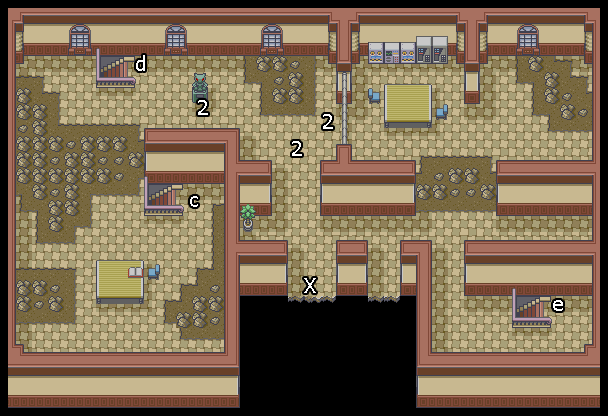 Au rez-de-chaussée, prenez l'escalier A puis l'escalier D, allez au point de chute X du 2ème étage (consultez la carte ), vous serez à nouveau au rez-de-chaussée.