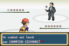 Giovanni possède un Rhinocorne de niveau 45, un Nidoqueen de niveau 44, un Triopikeur de nveau 42, un Nidoking de niveau 45 et un Rhinocorne de niveau 50. Ils sont faciles à battre avec un Pokémon eau ou plante, appuyé par un psy.