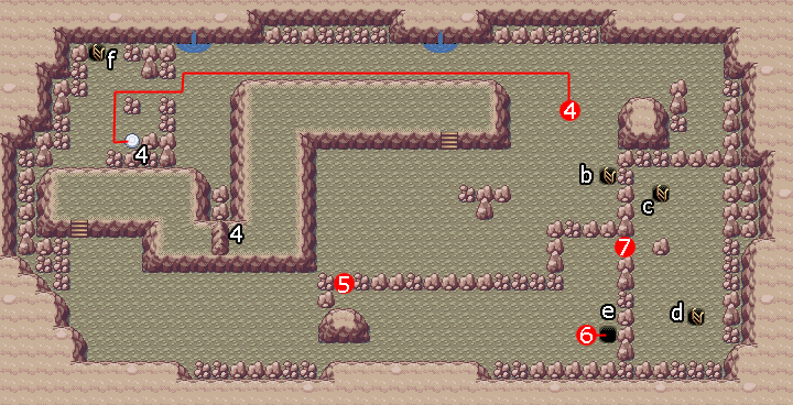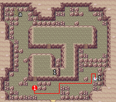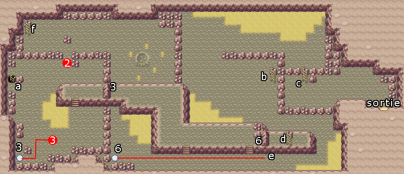 Cette grotte reprend le système de rochers des Îles Écume mais maintenant ils sont à placer sur des interrupteurs (ronds blancs sur les cartes) pour faire disparaître des terre-pleins qui bloquent le passage. Vous rencontrerez les Pokémon habituels des grottes (Nosferalto, Racaillou, Onix, Machopeur...) durant votre parcours, leur niveau va jusqu'à 48 donc soyez bien préparé pour ne pas avoir de mauvaises surprises. Il y a aussi des dresseurs qui ont des Pokémon diversifiés, vous êtes bientôt à la Ligue, le niveau est élevé !