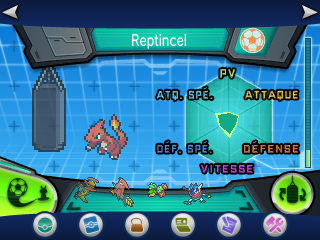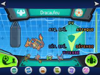 C'est sur cet écran que vous pourrez afficher le bilan de l'entraînement de votre Pokémon ! Le diagramme représente l'évolution de la distribution d'EV dans chaque statistique, à vous de trouver la meilleure combinaison pour rendre votre Pokémon le plus puissant possible ! (N'oubliez pas que sa nature influence aussi ! Référez-vous donc à cette page pour en savoir plus).