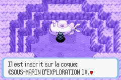 Une fois la petite grotte découverte, nous retrouvons le submersible volé à Poivressel par la Team Aqua (S)/ Magma (R).