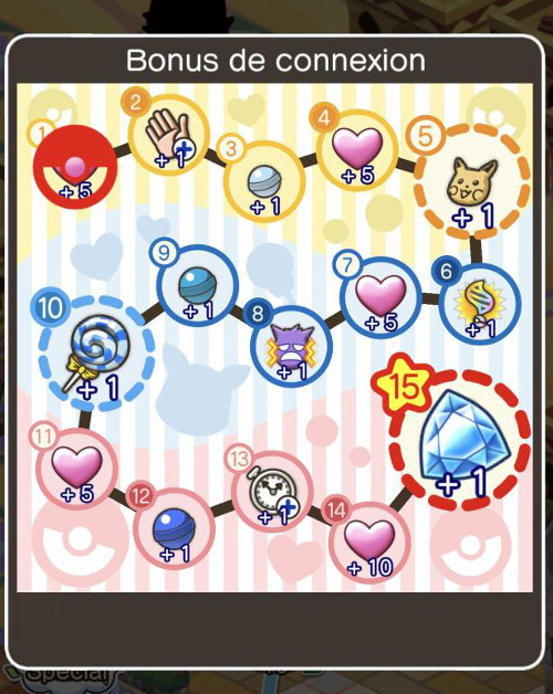 | Jour de connexion | 1 | 2 | 3 | 4 | 5 | 6 | 7 | 8 | 9 | 10 | 11 | 12 | 13 | 14 | 15 |