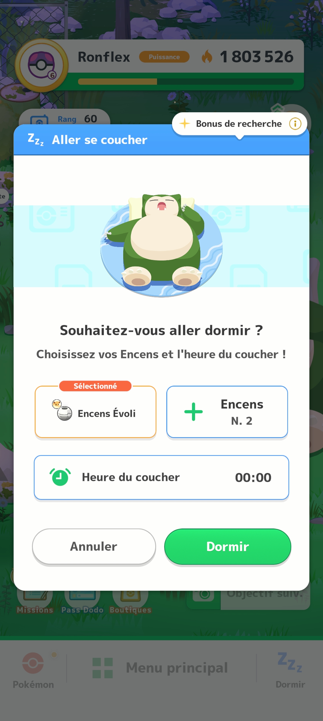 Pour effectuer une session de sommeil, il faut d'abord cliquer sur le bouton Dormir en bas à droite. Vous aurez une fenêtre comme au dessus. Vous pouvez choisir d'utiliser jusqu'à 2 Encens, mais au maximum 1 Encens qui attire un Pokémon. Vous devez choisir une Heure de coucher. L'intérêt de la respecter (entre 90 minutes avant et 30 minutes après) est de récupérer au réveil un cadeau de la Carte Cadodo. Si vous changez cette heure, votre Carte Cadodo sera remise à zéro.
